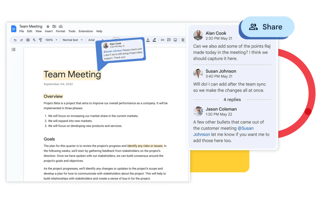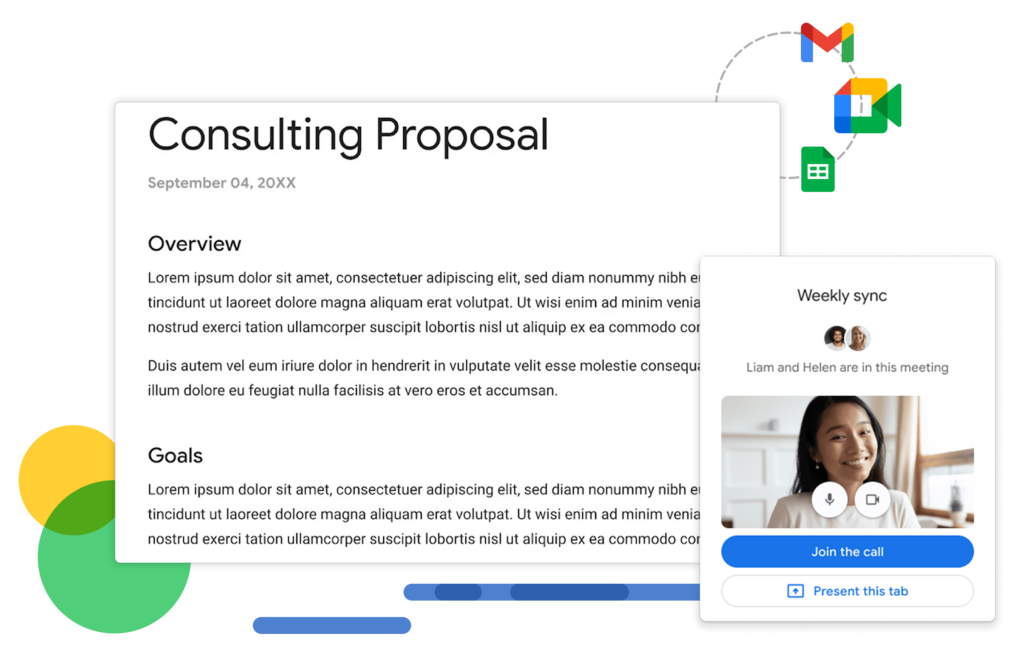 Nous vous ouvrons les portes vers une nouvelle ère de collaboration avec Google Workspace, la solution de pointe pour la coopération en ligne. Partagez instantanément vos idées dans des documents partagés, organisez des réunions virtuelles de qualité avec Google Meet, et profitez d’une accessibilité inégalée avec Google Drive.